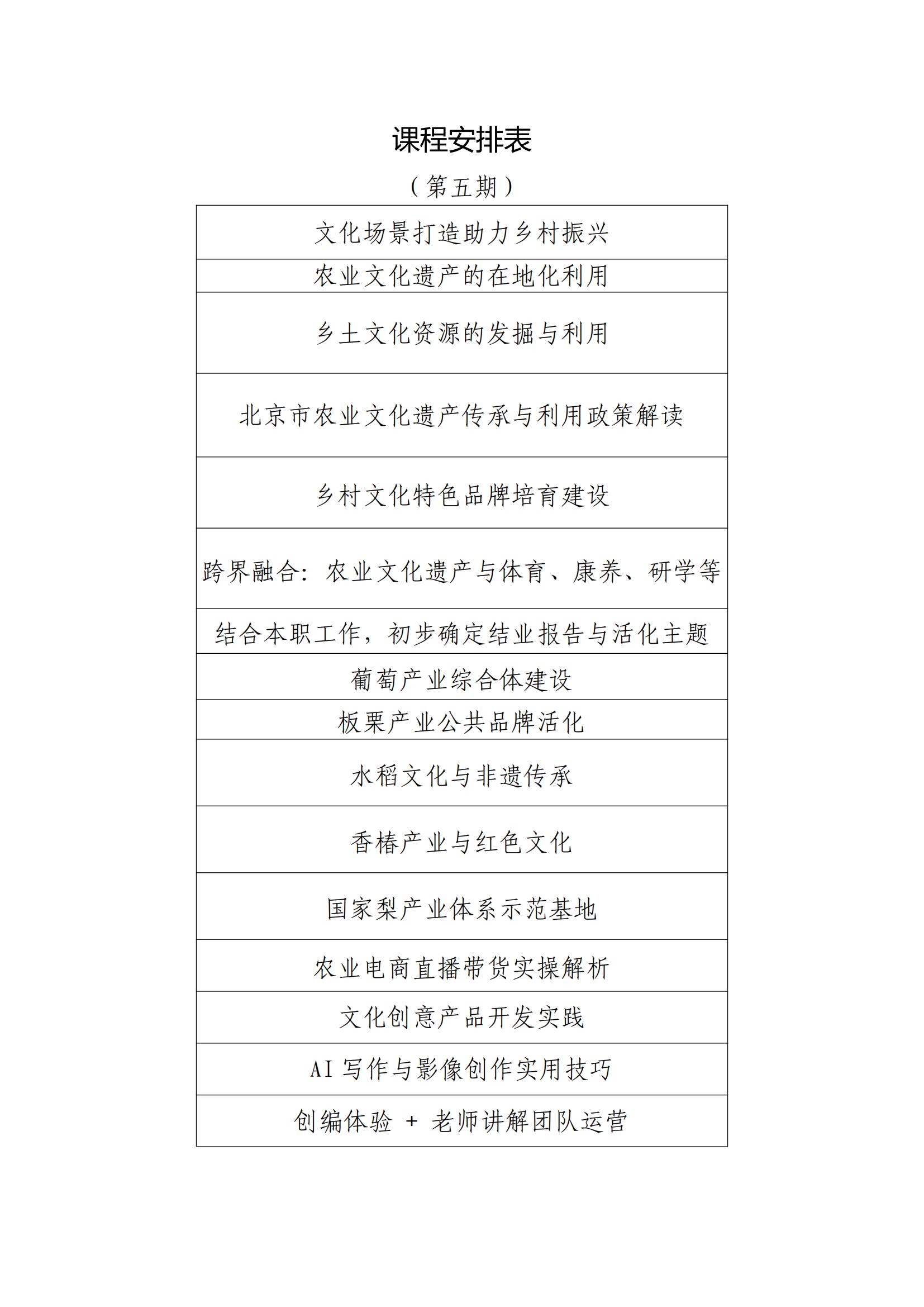 充分发挥北京四个中心定位,聚集丰富农业文化遗产资源,科技创新高地资源优势,突出应用导向,分“理念引领与政策解读、北京乡村文化资源挖掘与创意转化、农文旅产品设计与商业模式创新、运营管理与服务提升、实地考察与项目路演”五大课程模块,邀请行业专家、企业家、文化学者、设计师、平台运营专家、政府工作人员等共同授课,努力培养一批深刻理解北京乡村文化价值、熟练掌握农文旅融合实操技能、具备项目运营管理和市场开拓能力的“新农人”骨干。