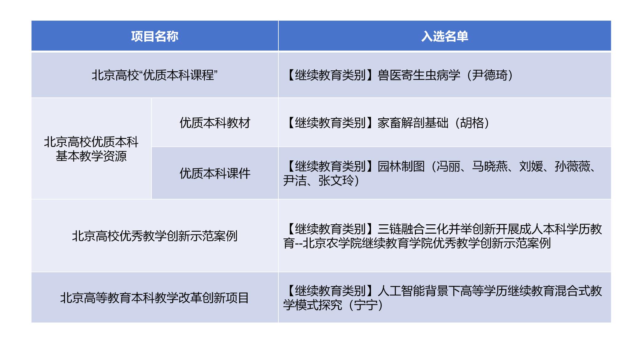 本次评选中,继续教育学院成果亮点纷呈:胡格教授主编的《家畜解剖基础》入选“北京高校优质本科教材(继续教育类)”,尹德琦老师主讲的《兽医寄生虫病学》入选“北京高校优质本科课程(继续教育类)”,冯丽、马晓燕、刘媛、孙薇薇、尹洁、张文玲等老师主讲的《园林制图》入选 “北京高校优质本科课件(继续教育类)”,刘林场老师完成的《三链融合 三化并举 创新开展成人本科学历教育》案例入选“北京高校优秀教学创新示范案例(继续教育类)”;宁宁老师主持的《人工智能背景下高等学历继续教育混合式教学模式探究》入选“北京高等教育本科教学改革创新项目(继续教育类)”,实现了教材、课程、课件、案例、教改项目的多点突破。